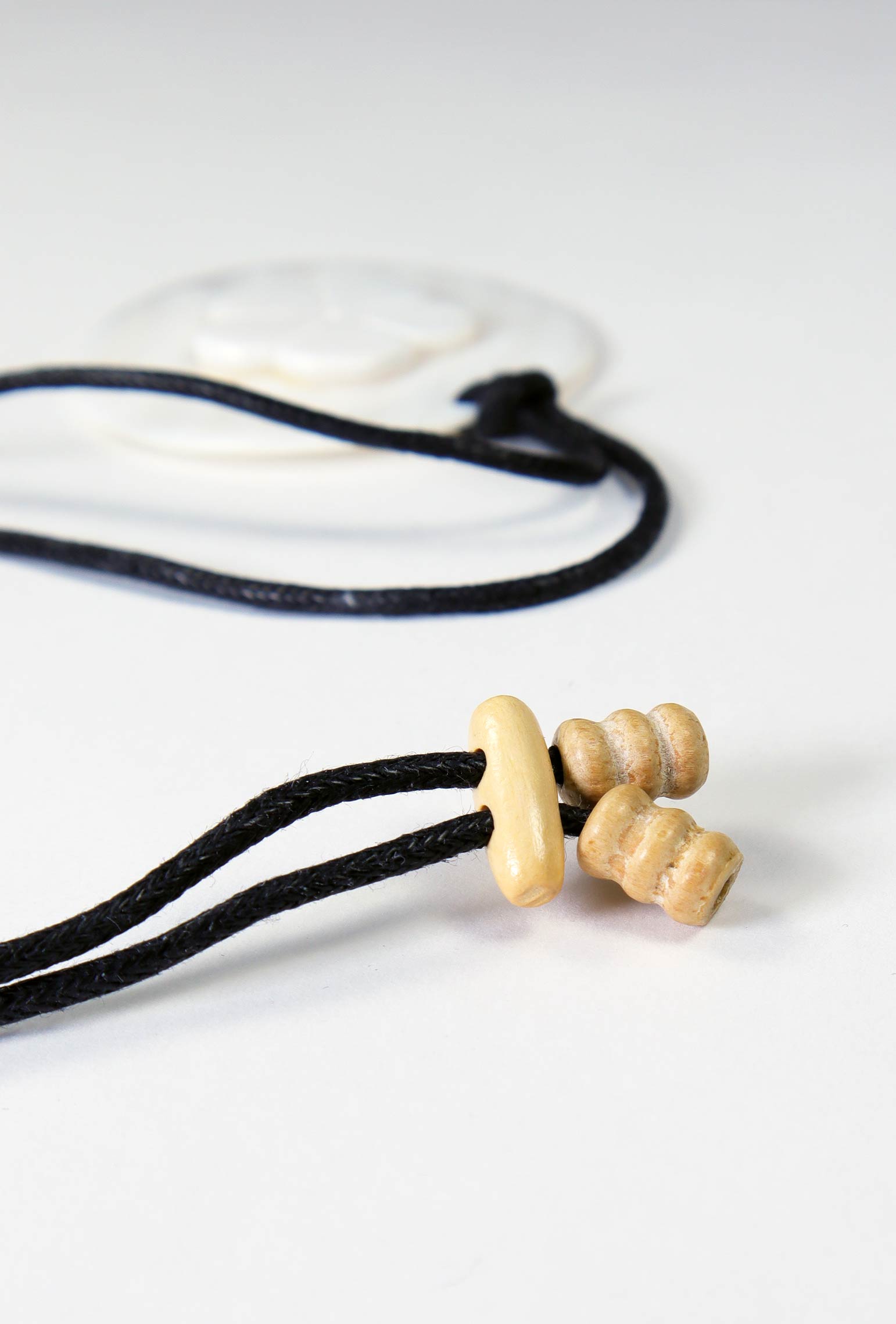 The textile strap is decorated with wooden beads and can therefore be individually adjusted in length. Since mother-of-pearl is a natural material, each of these handmade pieces of jewelry is unique - as unique as the wearer.