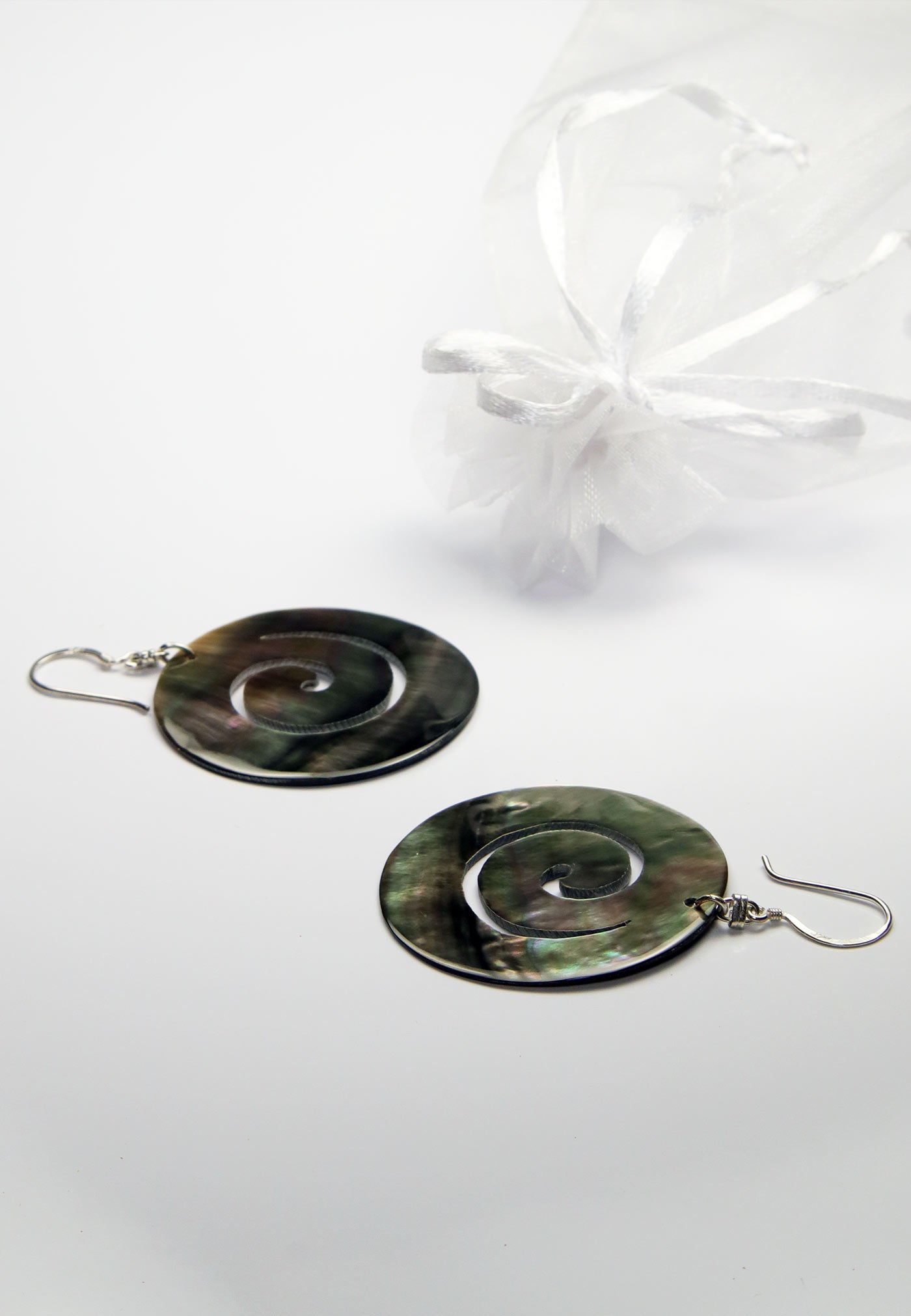 These beautiful earrings made of real mother-of-pearl shimmer in subtle, iridescent green-pink-gray-brown tones with every movement. The symbol of the spiral is a symbol of cycle and evolution. These wonderful earrings reflect the spiral of LIFE FORCE; in the course of evolution, life force has grown steadily and become stronger in the cycle.