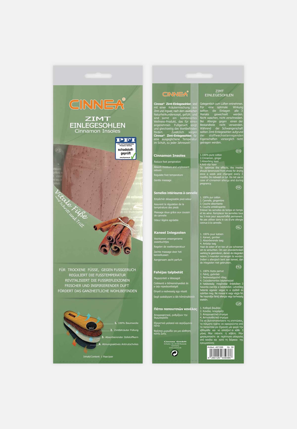 CINNEA® Zimt-Einlegesohlen, auch als „CINNEA-Sohlen“ bekannt, verwenden eine bewährte Zimt-Kräutermischung aus der chinesischen Heilkunde. Besonders effektiv ist ihre Schweiß absorbierende Wirkung, die dank der antibakteriellen Eigenschaft des Zimtes nasse Füße verhindert und unangenehmen Fußgeruch vorbeugt. Ingwer in der Mischung verbessert zudem den Blutkreislauf und wirkt gemeinsam mit Zimt gegen Durchblutungsstörungen, wodurch ein angenehmes Fußklima entsteht – unabhängig von der Jahreszeit.