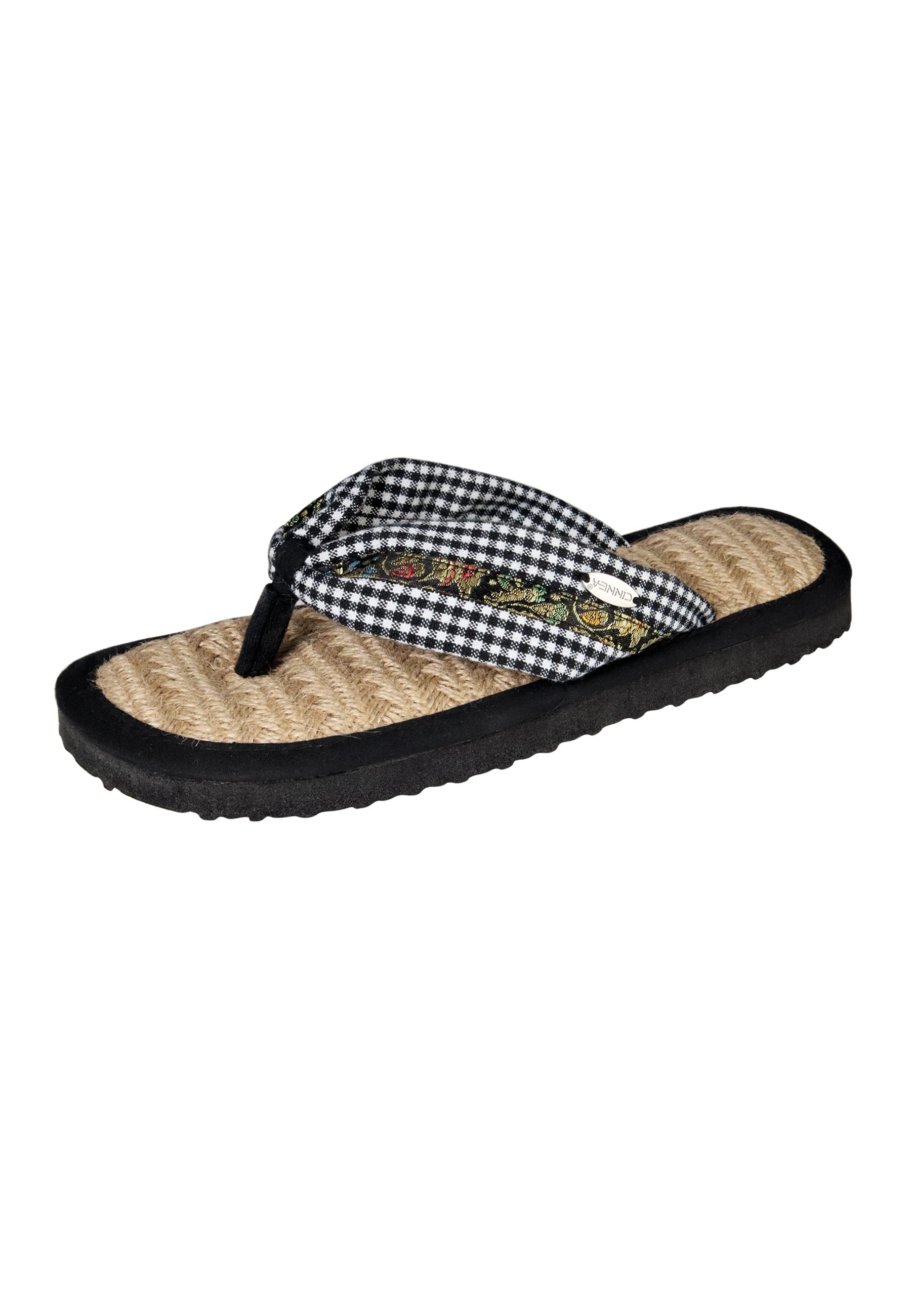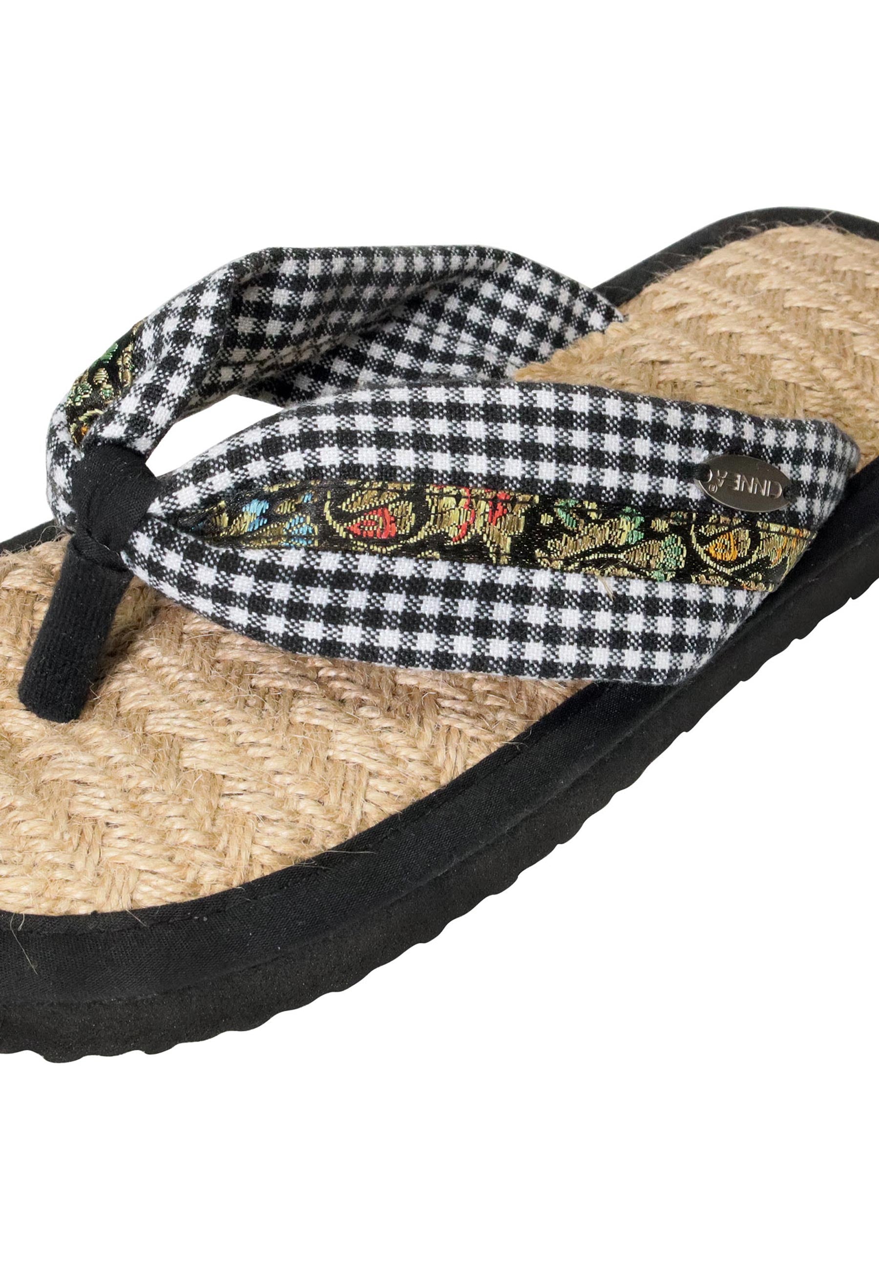 Eine dezent bunte Litze im asiatisch-floralem Design ziert zusätzlich den Riemen und verleiht der Sandale somit einen besonderen Touch.