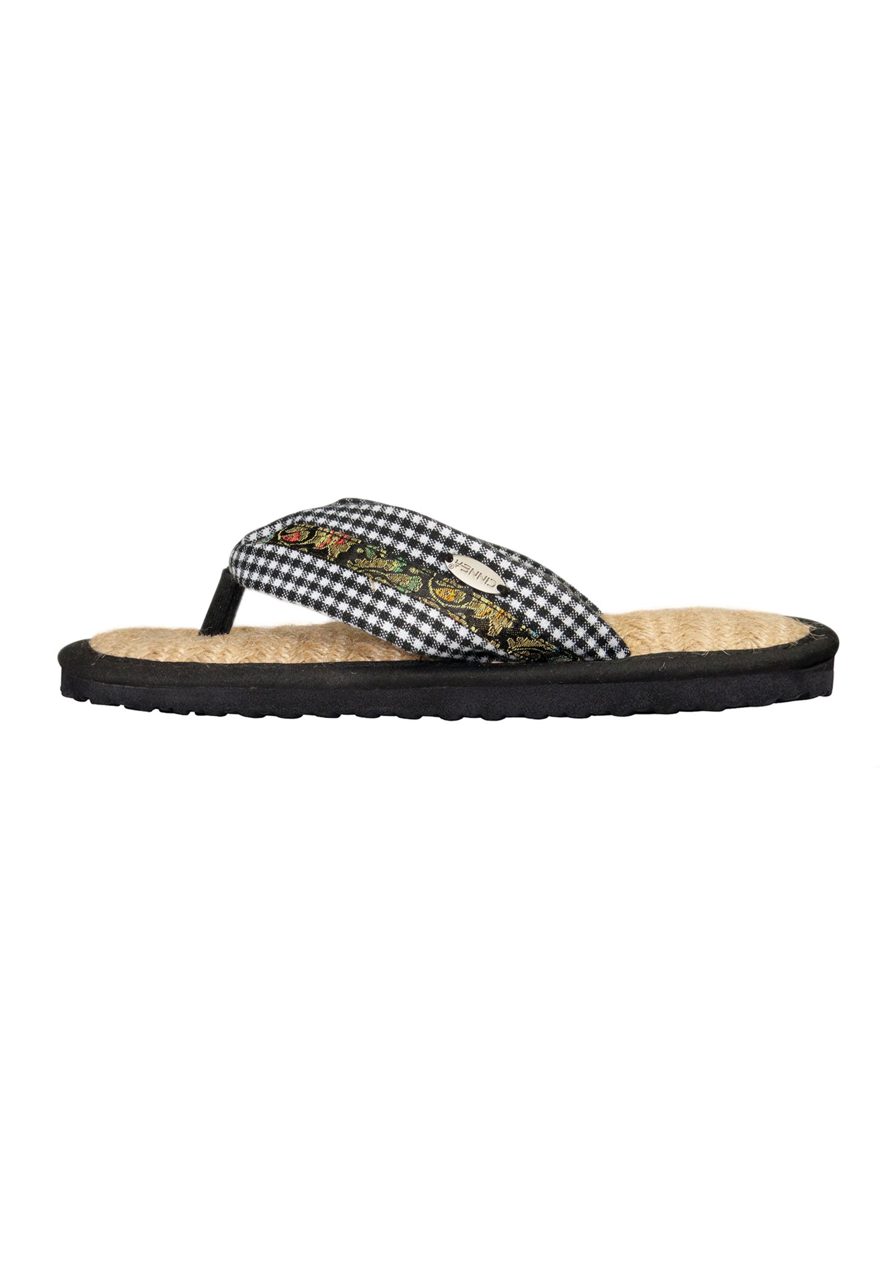 Der Oberriemen aus schwarz-weiß karierter Baumwolle wurde doppelt gelegt und vernäht, somit ist er angenehm gepolstert und schmiegt sich sanft dem Fuß an.