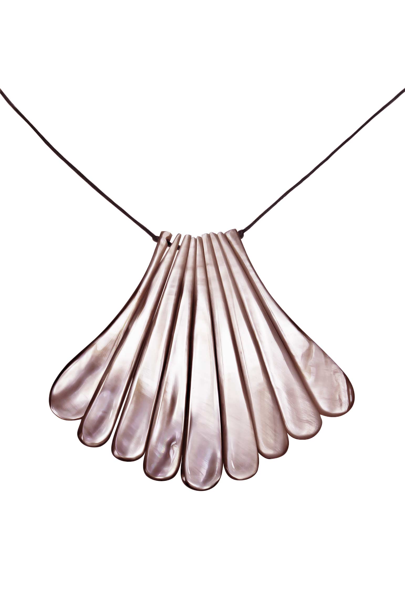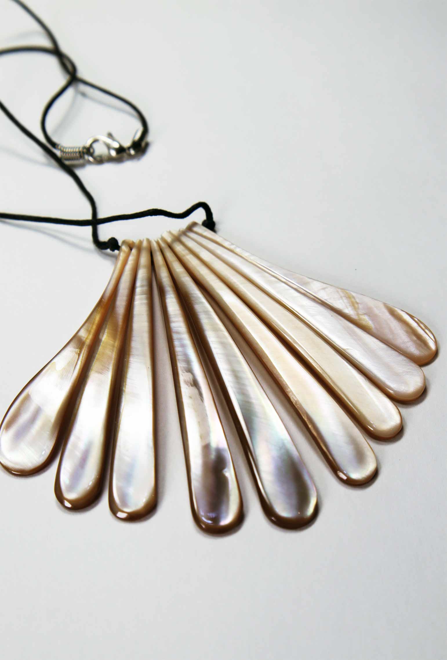 Die einzelnen Elemente fügen sich wie Puzzleteile aneinander und geben eine wunderschöne, fächerähnliche Form ab, die das Dekolleté fabelhaft umspielt. Die Farbtöne von Perlmutt lassen sich immer schwer beschreiben, hier wirken sie von hellbeige oder cremeweiß bis zu einem rosébraunen Farbton. Da Perlmutt ein Naturmaterial ist, fällt jedes Schmuckstück anders aus und wirkt auch anders, als auf diesem Foto. Es ist nur ein Beispielfoto.