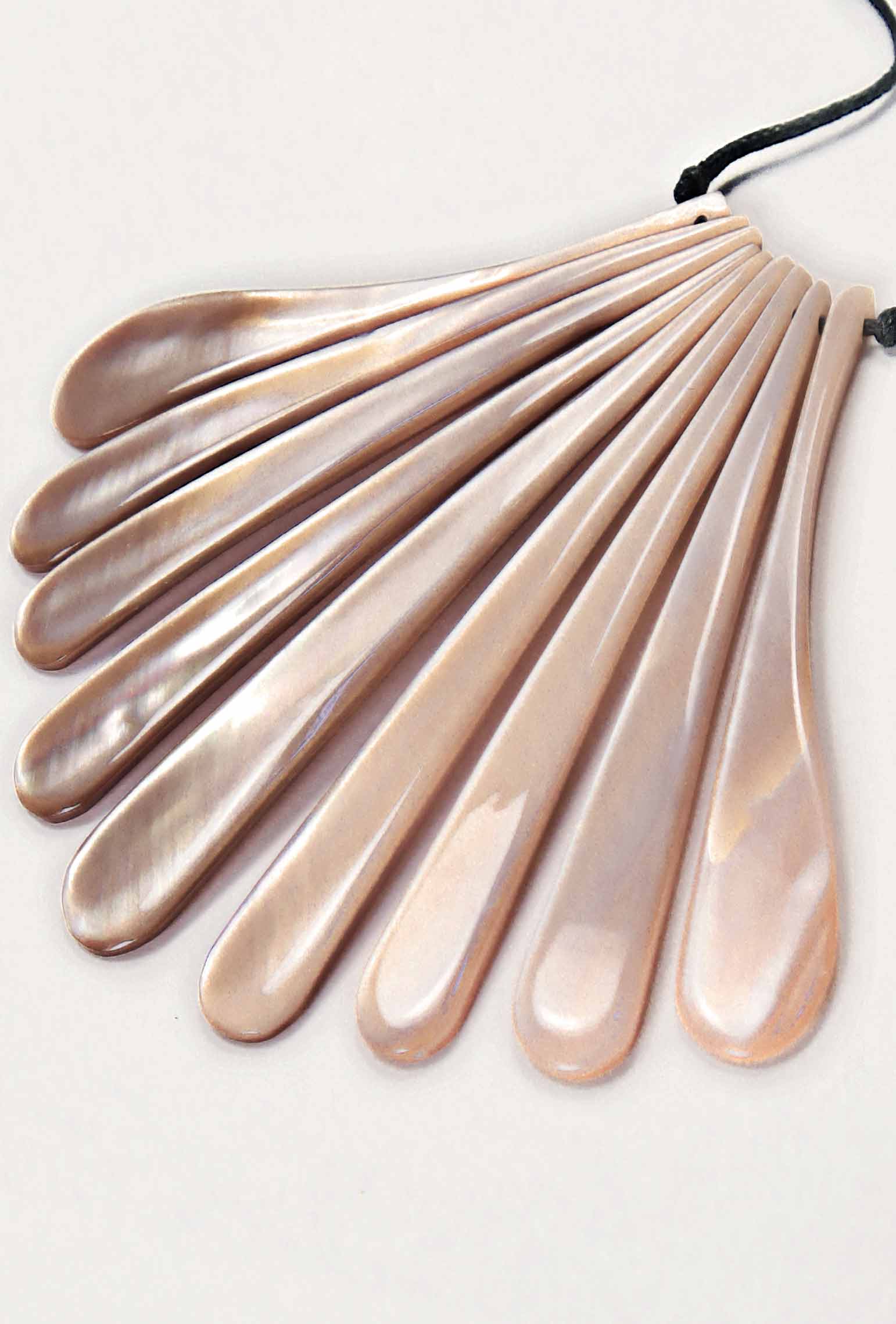 Wunderschönes Collier, dezent und edel zugleich! 9 unterschiedliche Anhängerelemente aus echtem Perlmutt zieren dieses Collier. Echte Handarbeit. Jedes Stück ist ein Unikat. Die einzelnen Elemente schimmern bei jeder Bewegung in irisierenden creme-beige Farbtönen. Das äußerste, kurze Element misst ca. 6 cm Länge und das mittlere, längste Element misst ca. 7,5 cm Länge.