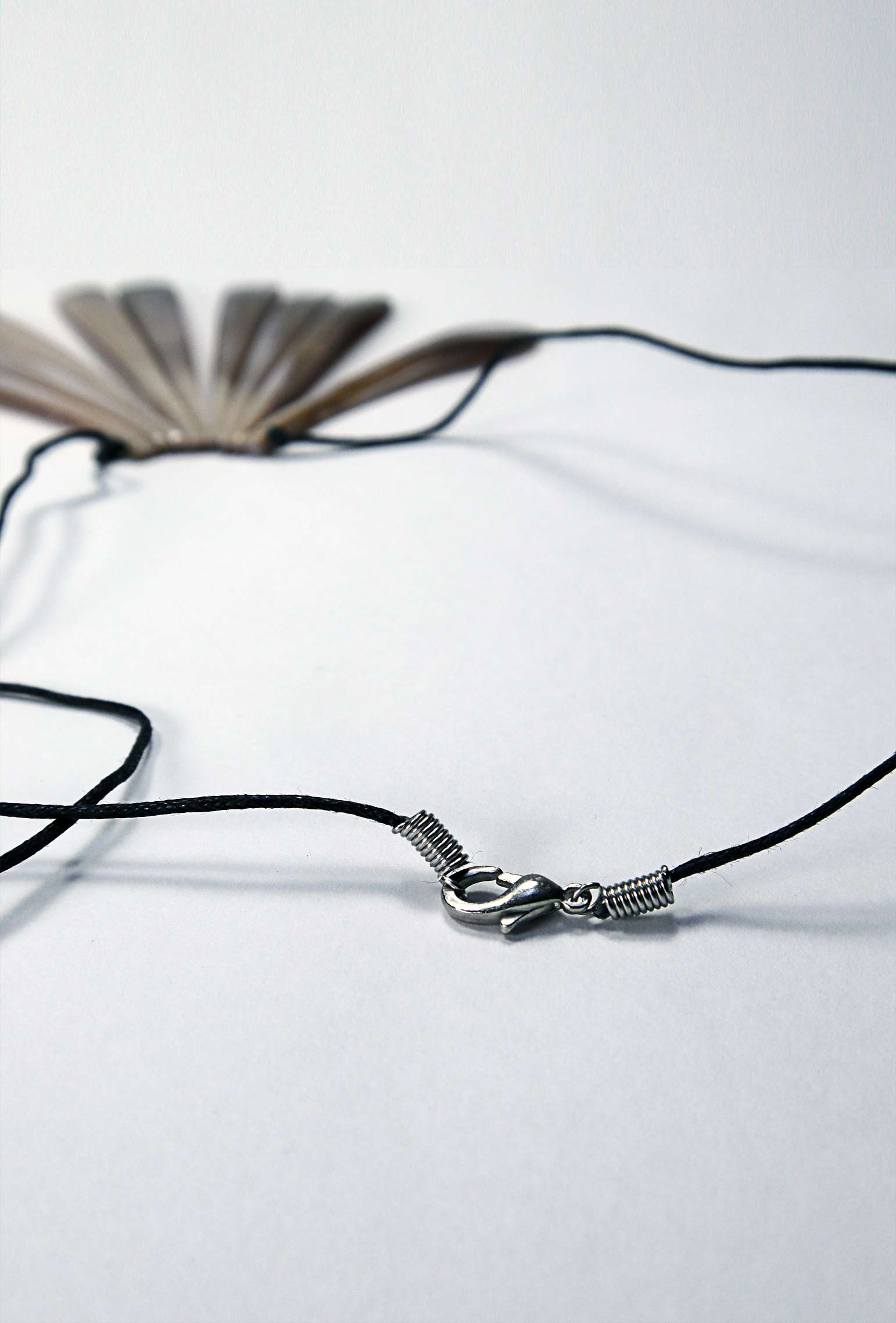 Das schwarze Textilband ist ca. 50 cm lang (Gesamtläng) und mit einem Karabinerverschluss versehen. Die Tragelänge der Halskette vom Verschluss bis Perlmuttende beträgt ca. 31 cm.