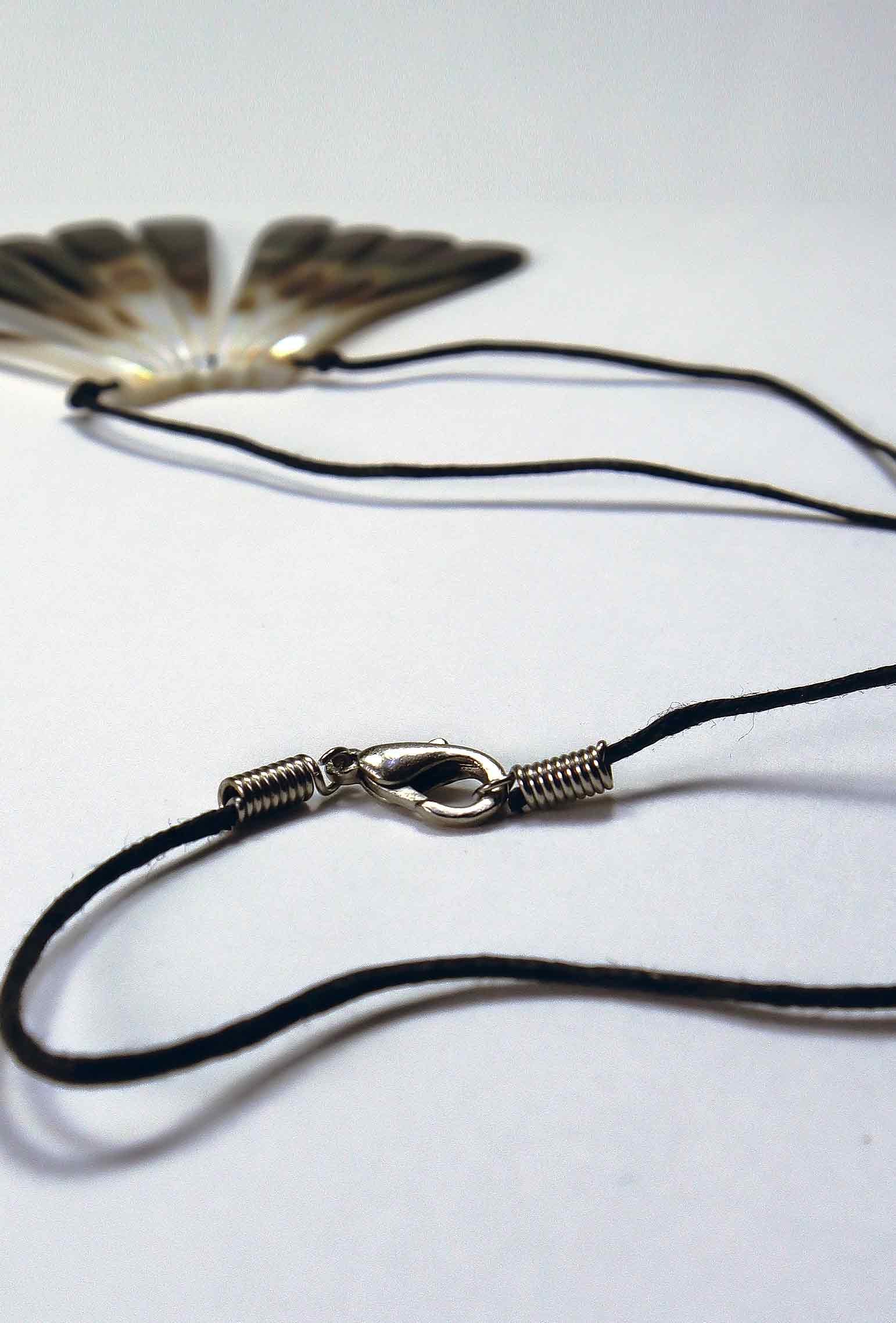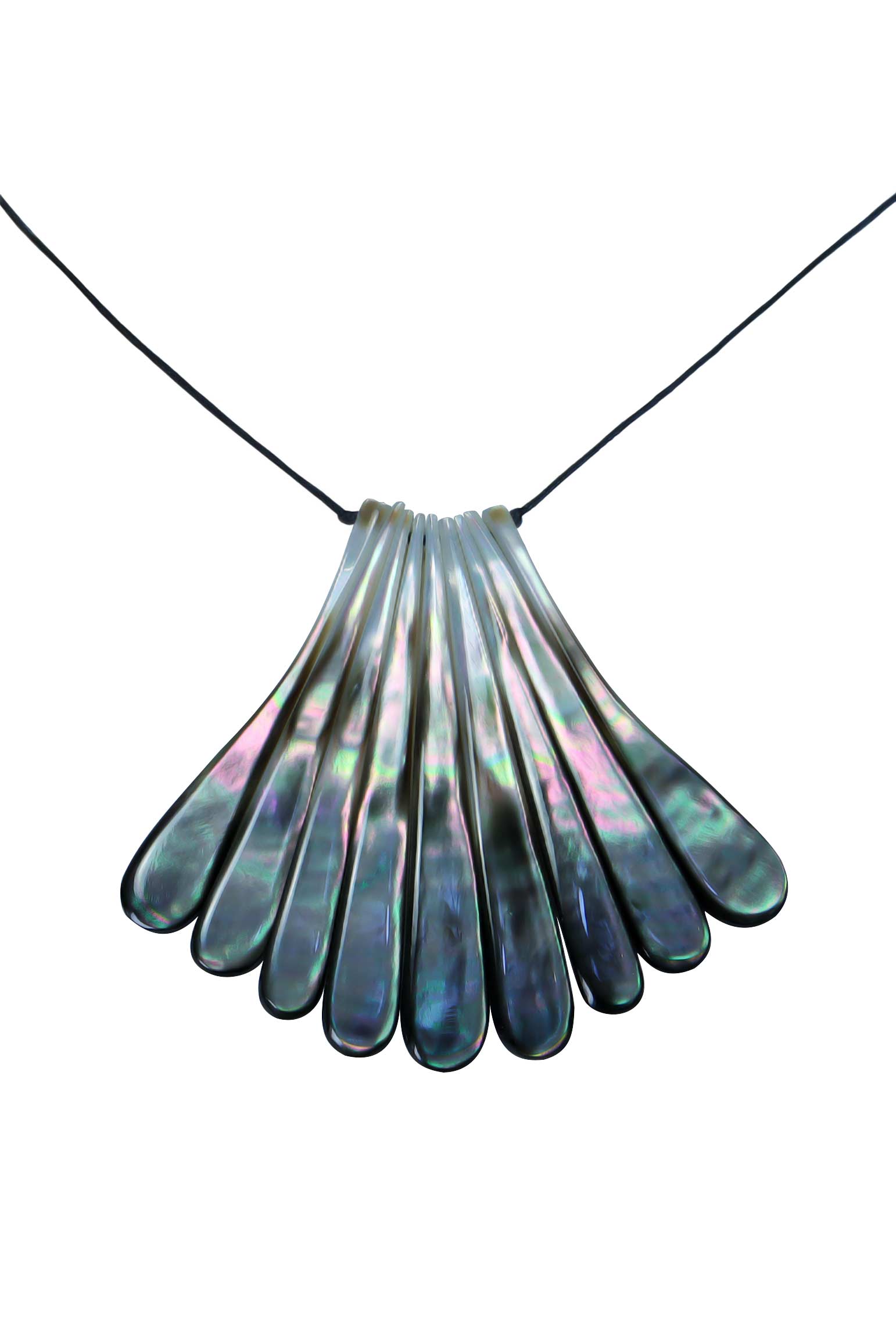 Anhänger: Muschel (Perlmutt), ca. 5 x 7 cm. Kette: Textil (schwarz), ca. 45 cm. Verschluss: 925er Silber.