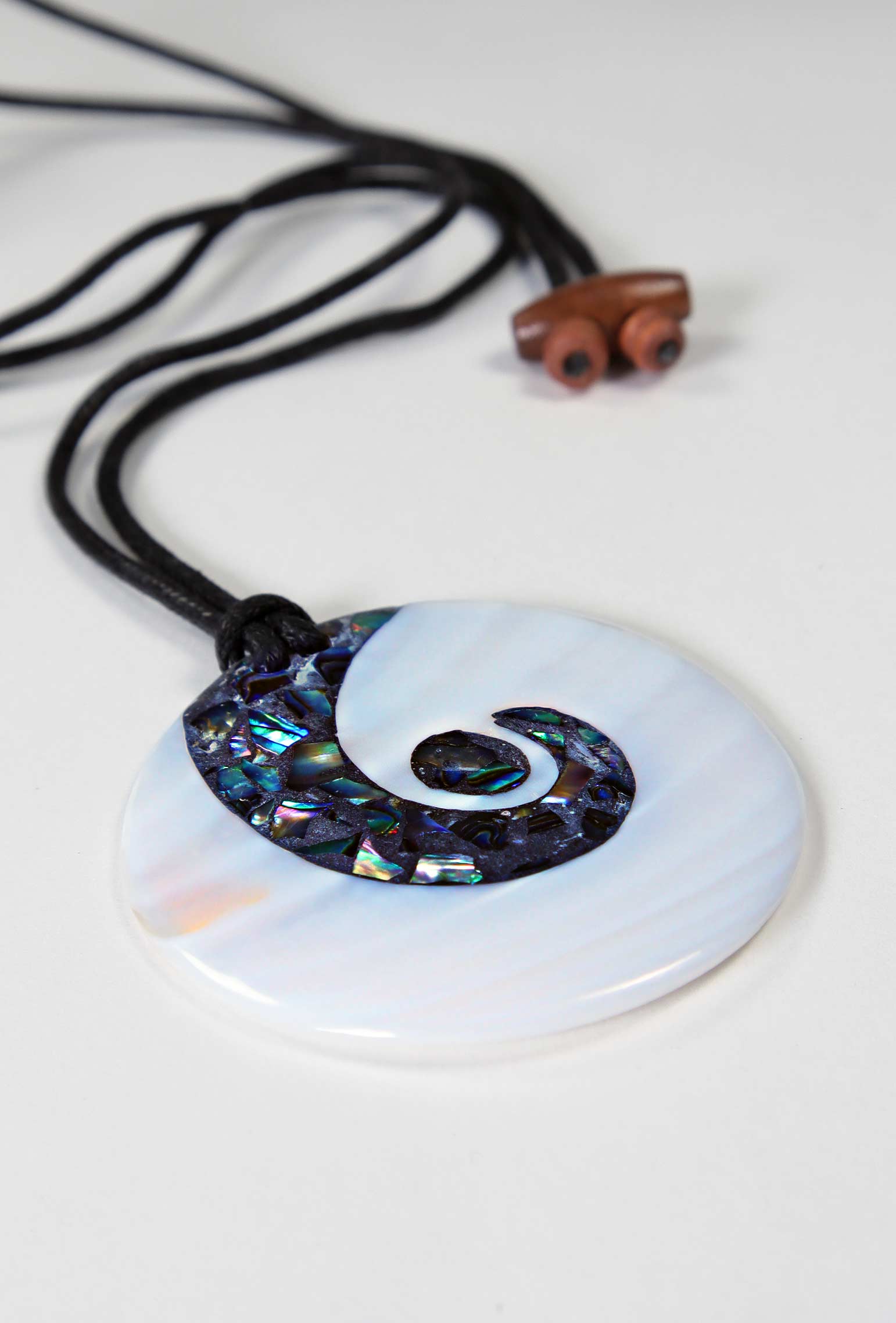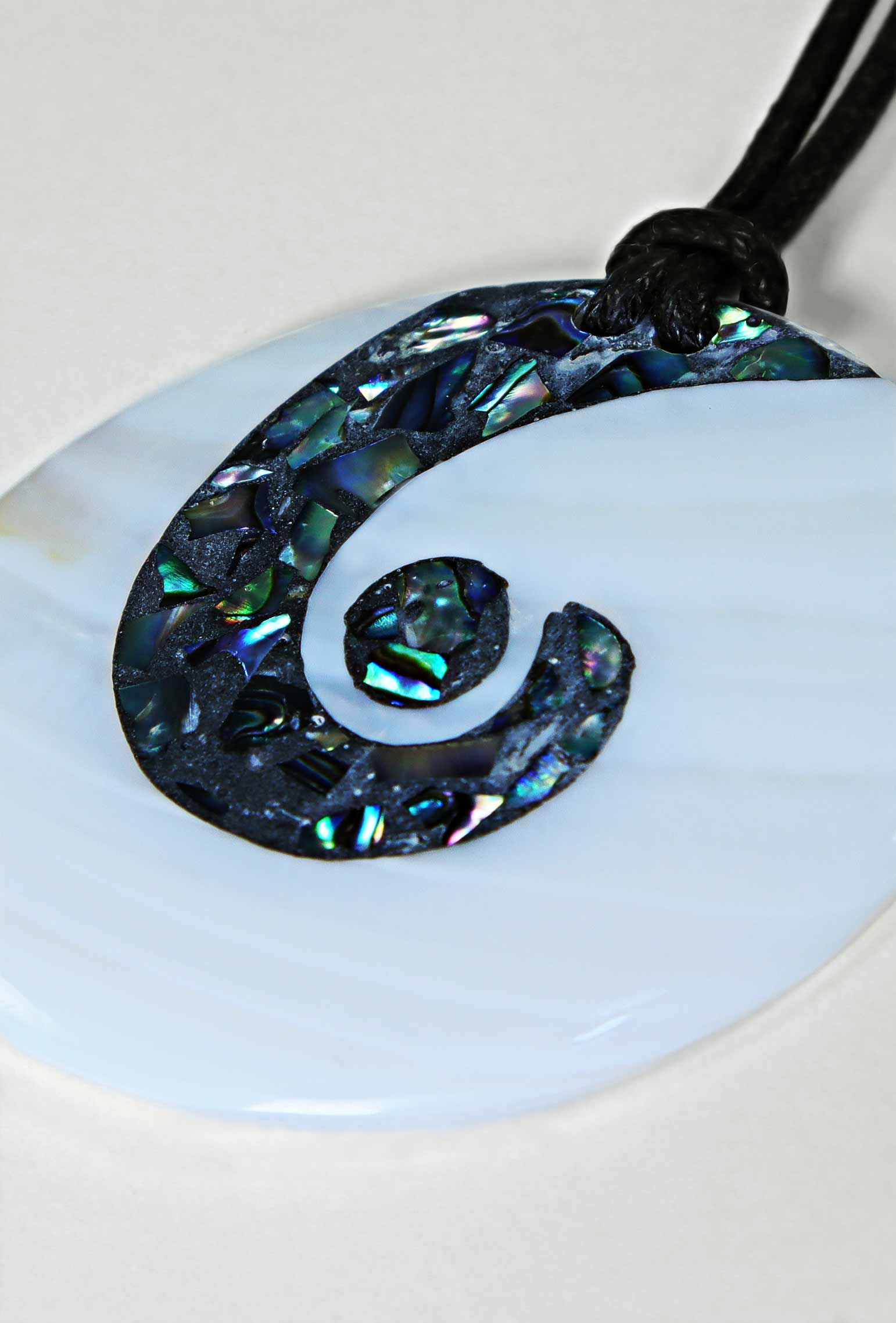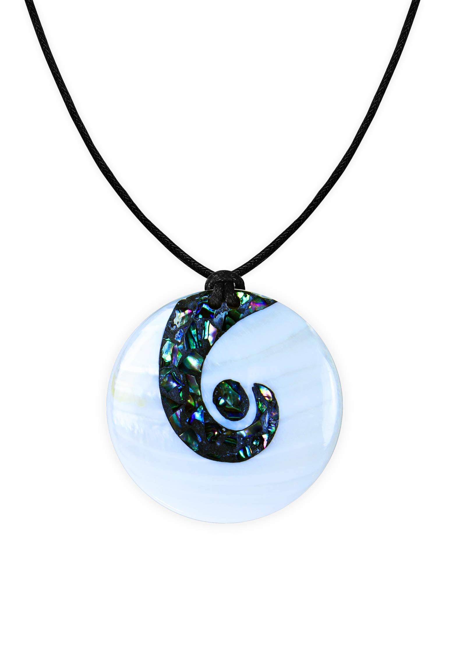 Diese Kette ist ein echter Blickfang! Sie hat einen wunderschönen Anhänger aus echtem Perlmutt, der mit einer Spirale verziert ist - das Symbol der Unendlichkeit. Bei jeder Bewegung schimmert der Anhänger in irisierenden Cremeweißtönen und opalhaften Buntschimmern. In aufwendiger Filigranarbeit wurden die kleinen, grünlich schimmernden Perlmuttelemente auf die helle Perlmuttplatte aufgesetzt. Was für ein Kontrast!