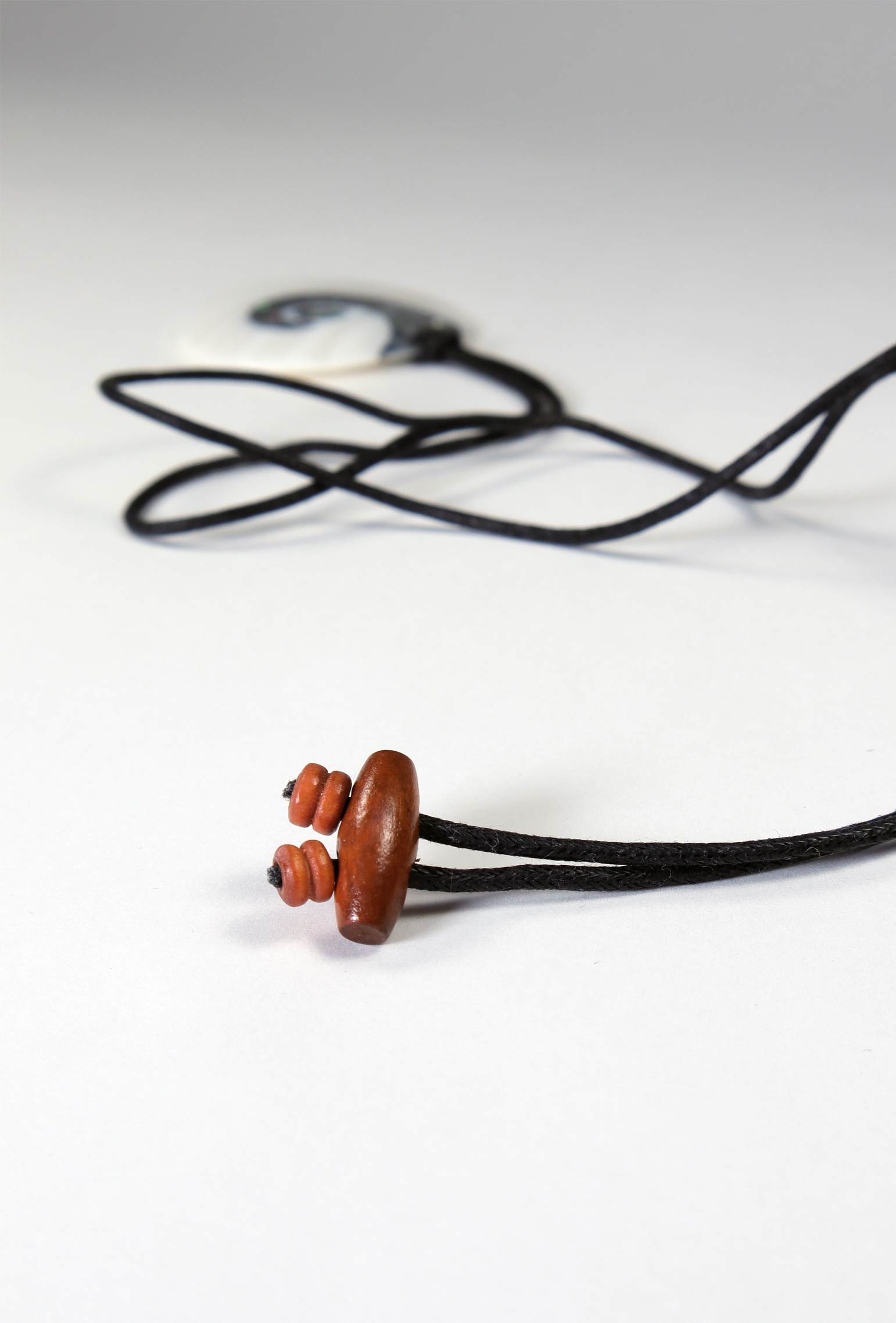 Anhänger: Durchmesser ca. 6 cm. Kette: Textil, ca. 70 cm Gesamtlänge, mit verstellbarem Holz-Verschluss.